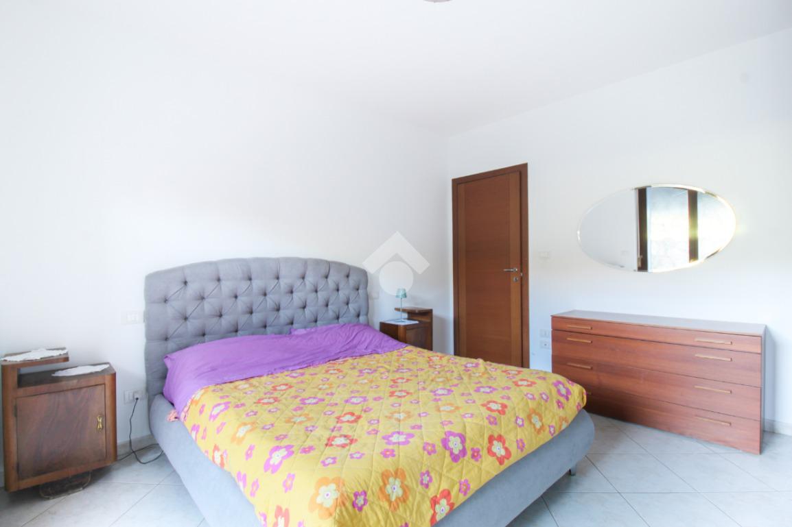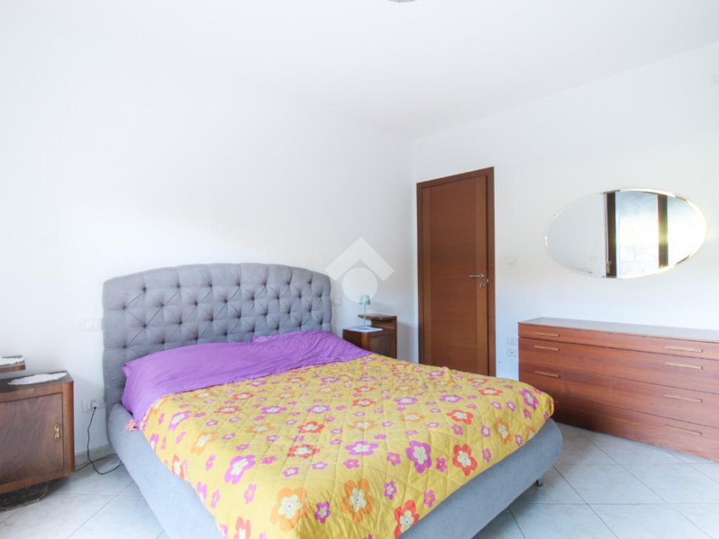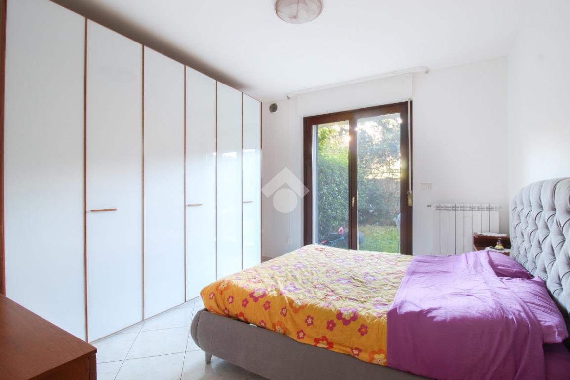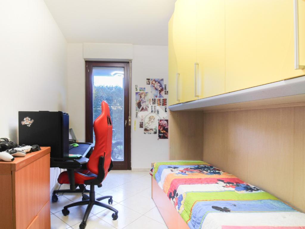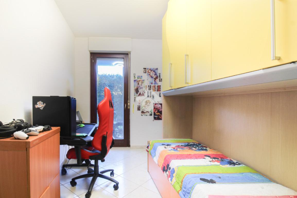 Un disimpegno conduce alla zona notte, composta da camera matrimoniale e cameretta con affaccio sul giardino, due bagni, di cui uno finestrato con vasca.