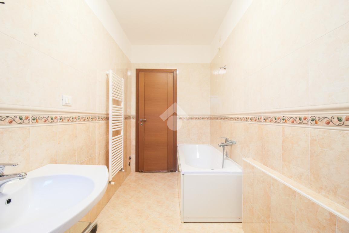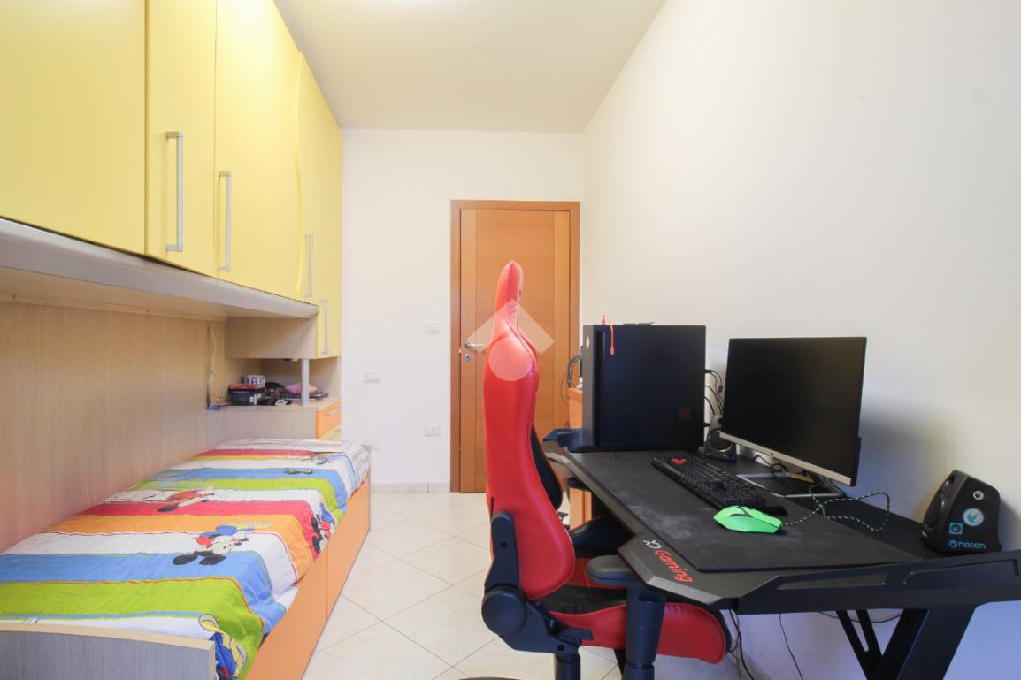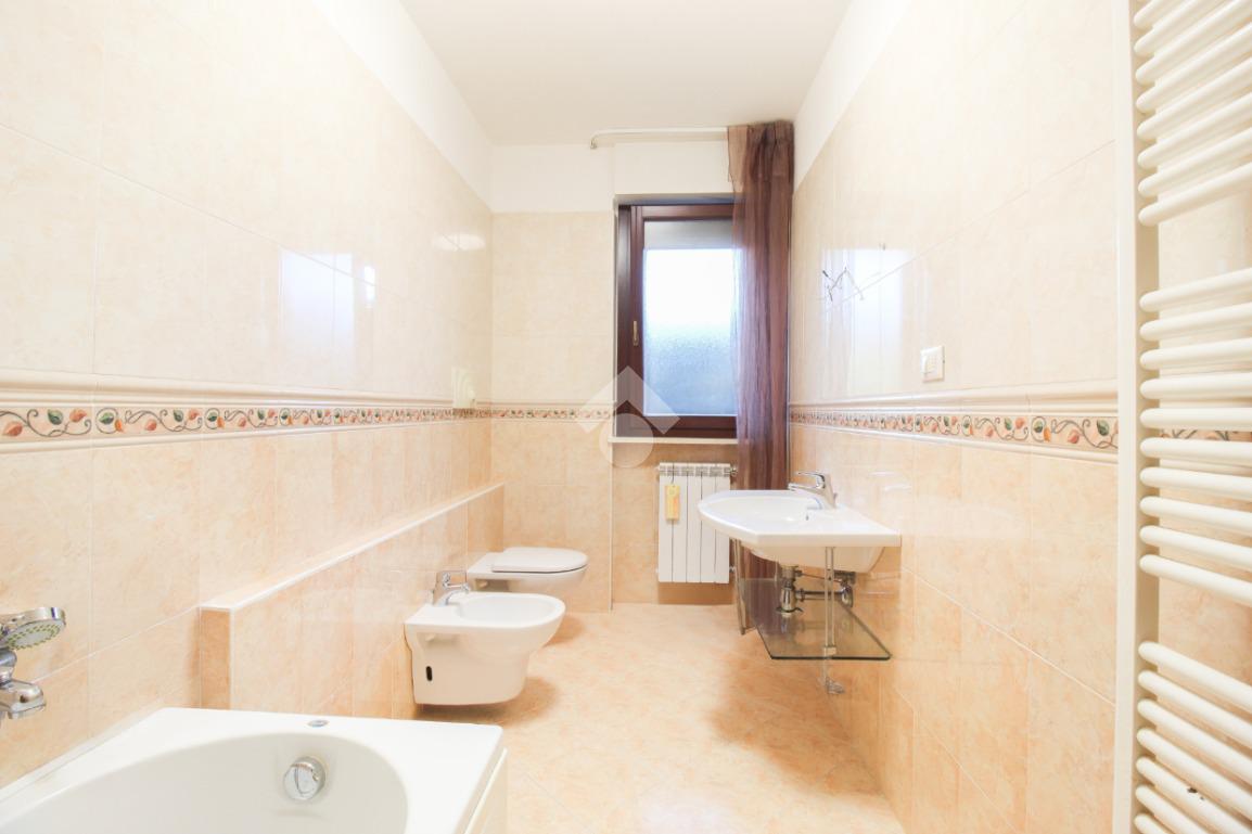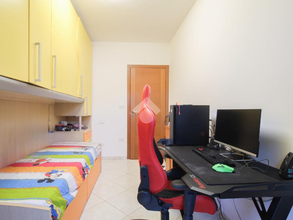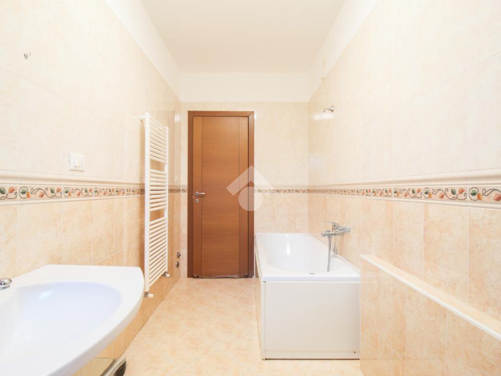 Un disimpegno conduce alla zona notte, composta da camera matrimoniale e cameretta con affaccio sul giardino, due bagni, di cui uno finestrato con vasca.