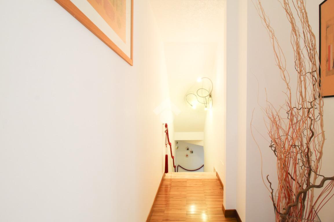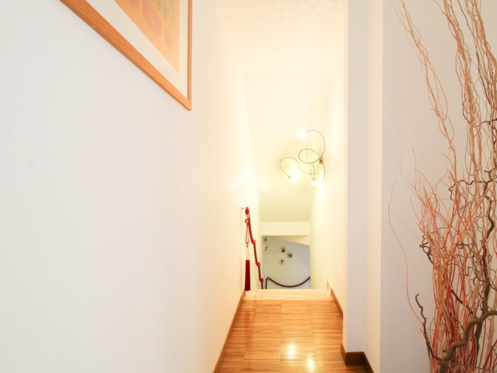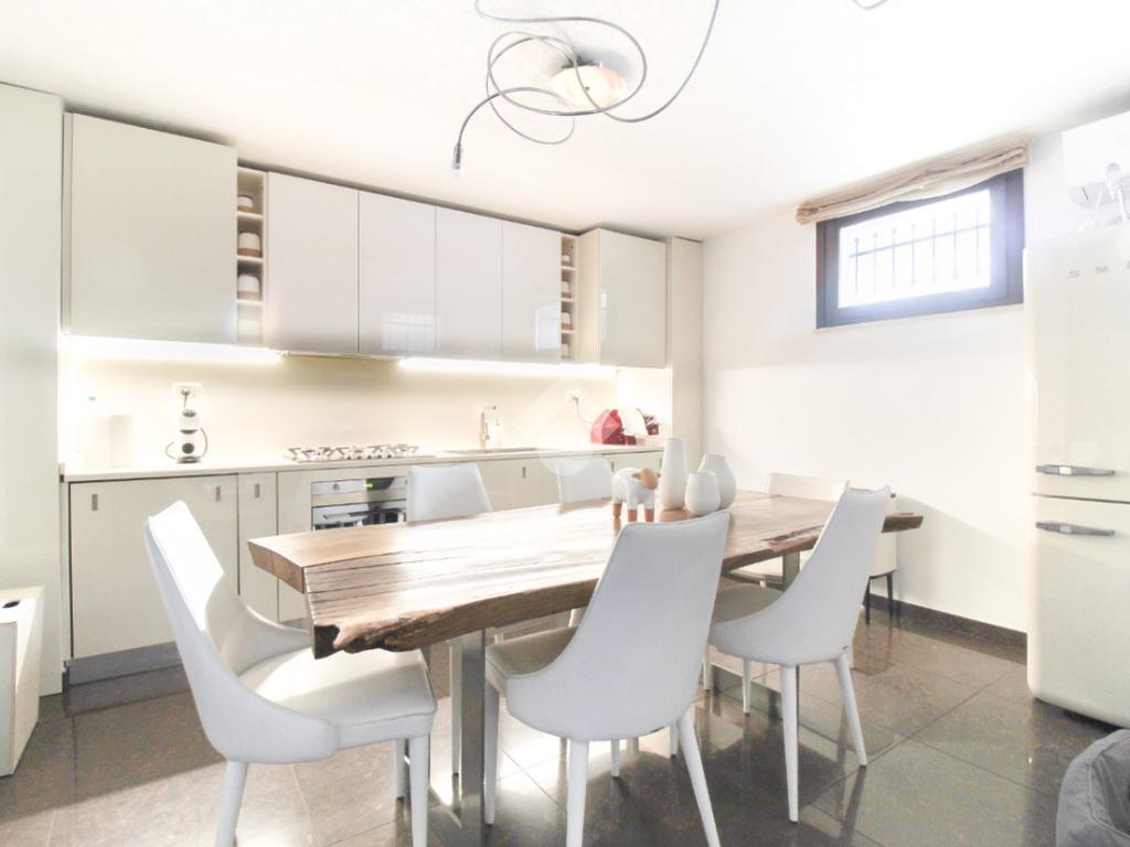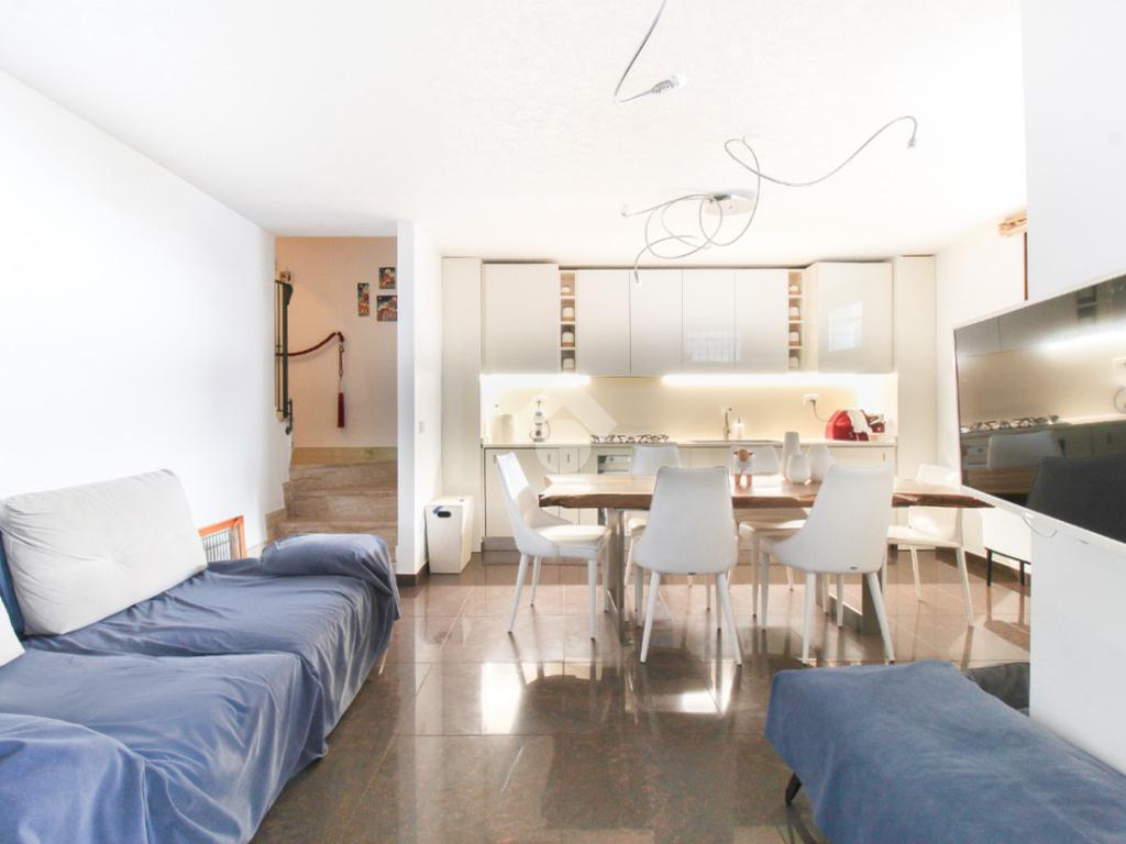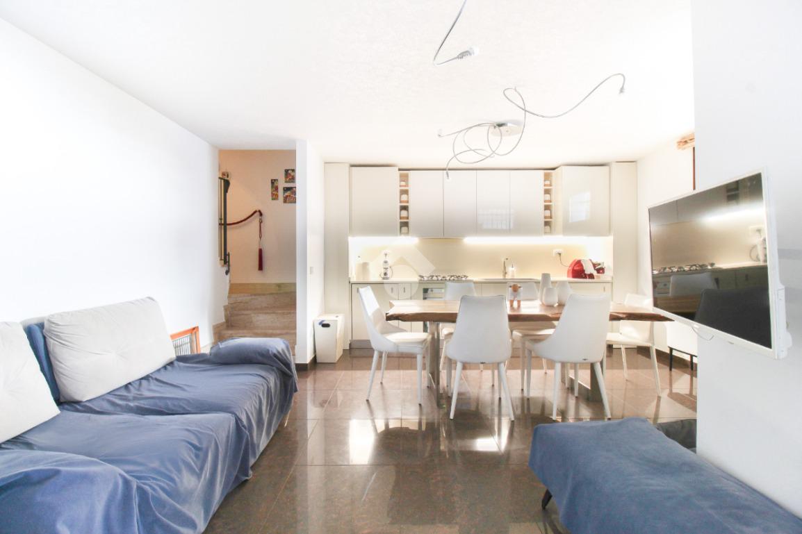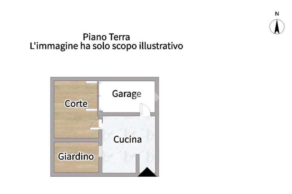 Tramite scale interne si accede alla zona giorno, al piano terra, composto da moderna cucina abitabile con affaccio sulla corte pavimentata e giardino, comodo ripostiglio e accesso diretto al garage.